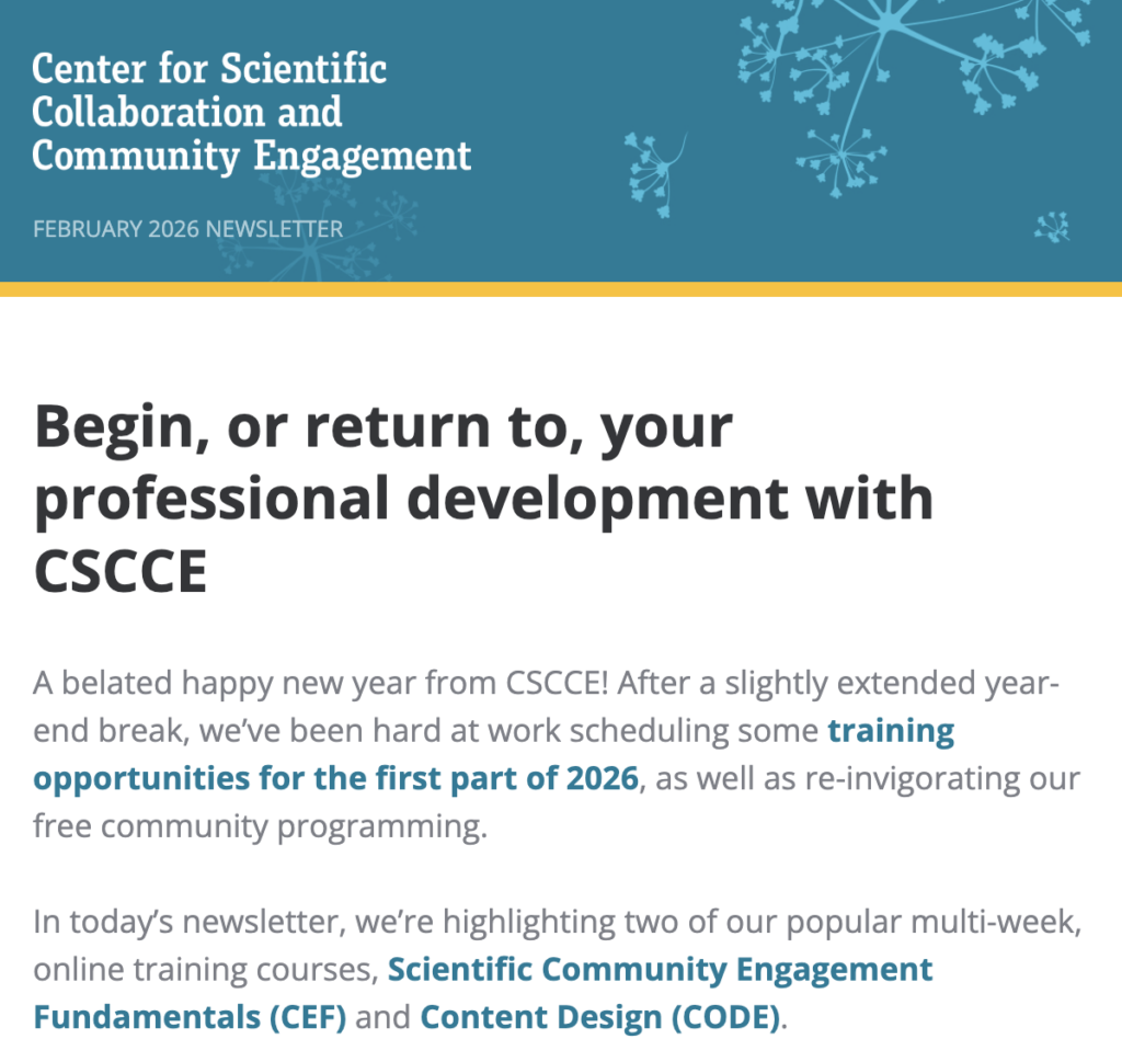 Here you’ll find links to our CSCCE newsletters – which include monthly round-ups of activities and resources plus occasional emails about program announcements and deadlines. If you’re not yet on our mailing list, you can sign up here.
